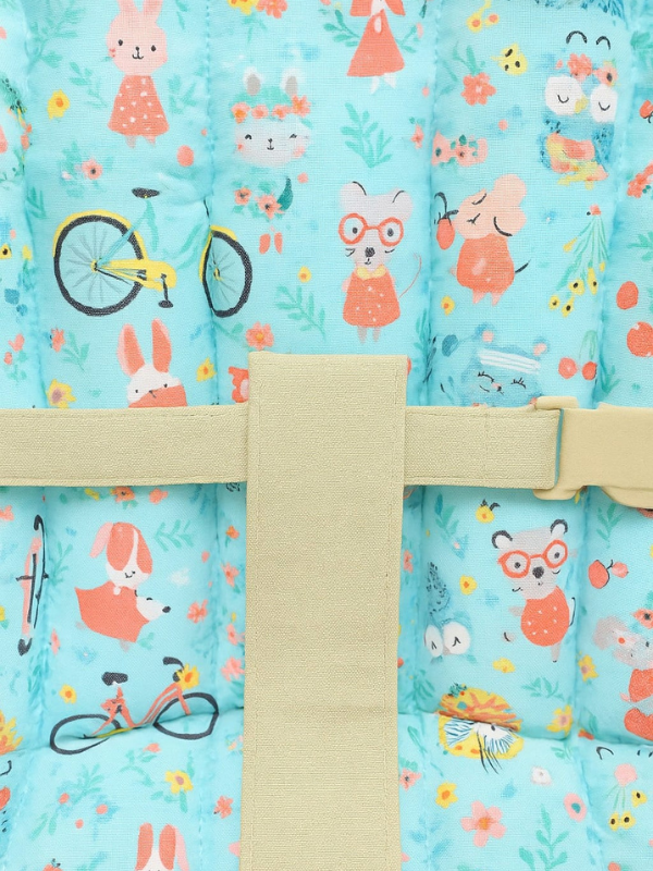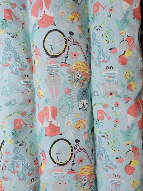 - Almohadón: gabardina celeste con diseños en rojos, rosas. El color puede variar en la foto.
