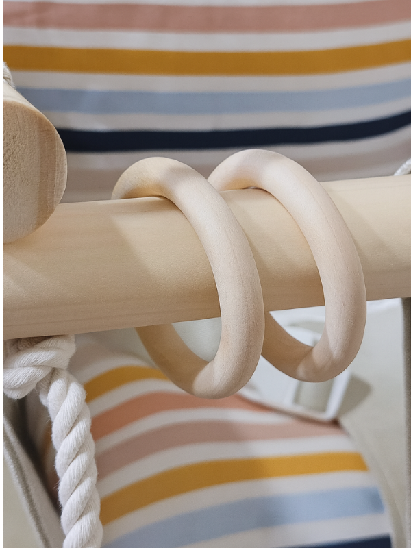 Contiene un kit de instalación muy seguro, con Pitones cerrados con sus tarugos para paredes o losa, y mosquetón para que sea desmontable y fácil de trasladar. Las 4 sogas se unen en 2 puntos diferentes, de manera tal que su movimiento sea más suave.