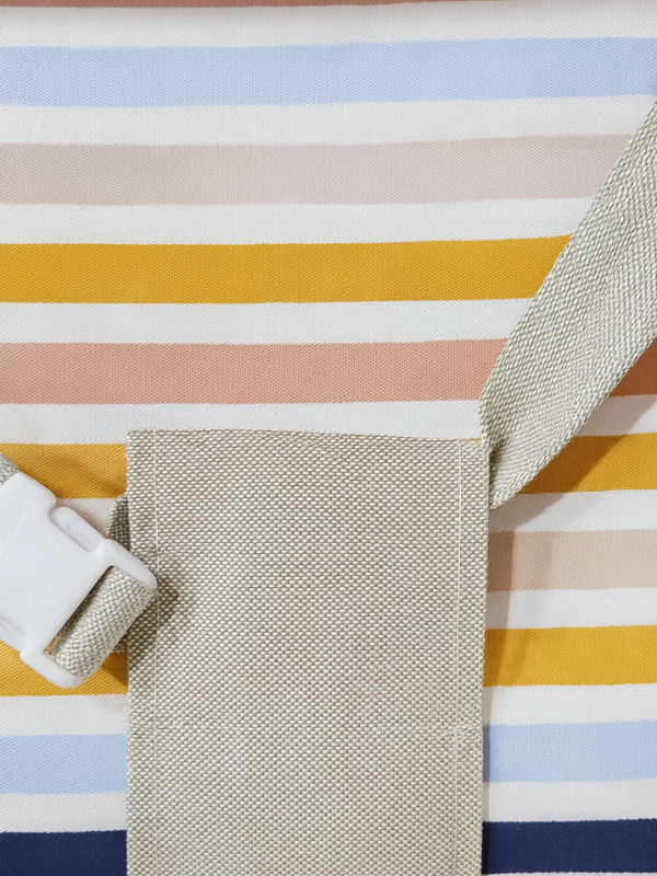 Color almohadón: Blanco con rayas horizontales en rosa, celeste, azul, ocre.