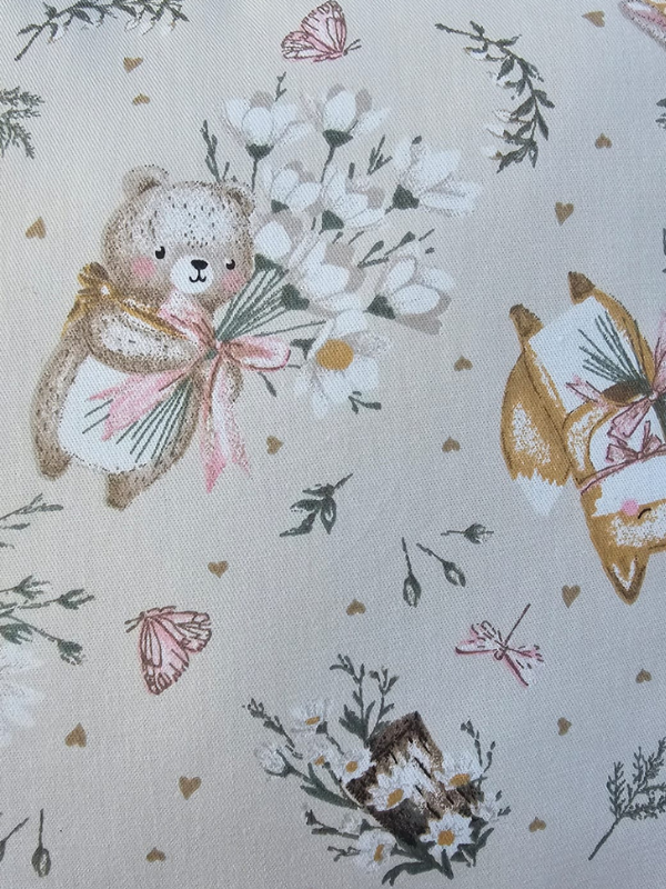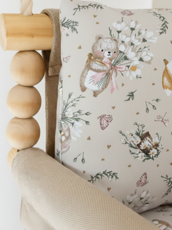 Color almohadón: natural con diseños de animales y flores en ocre, verdes, tostado y rosa.